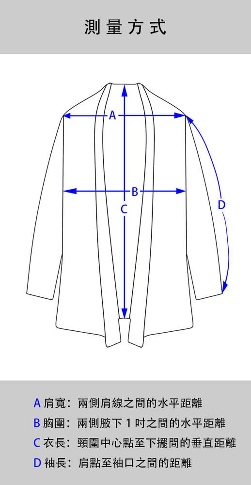 | Size(cm) | 肩寬 | 胸圍 | 衣長 | 袖長 | |